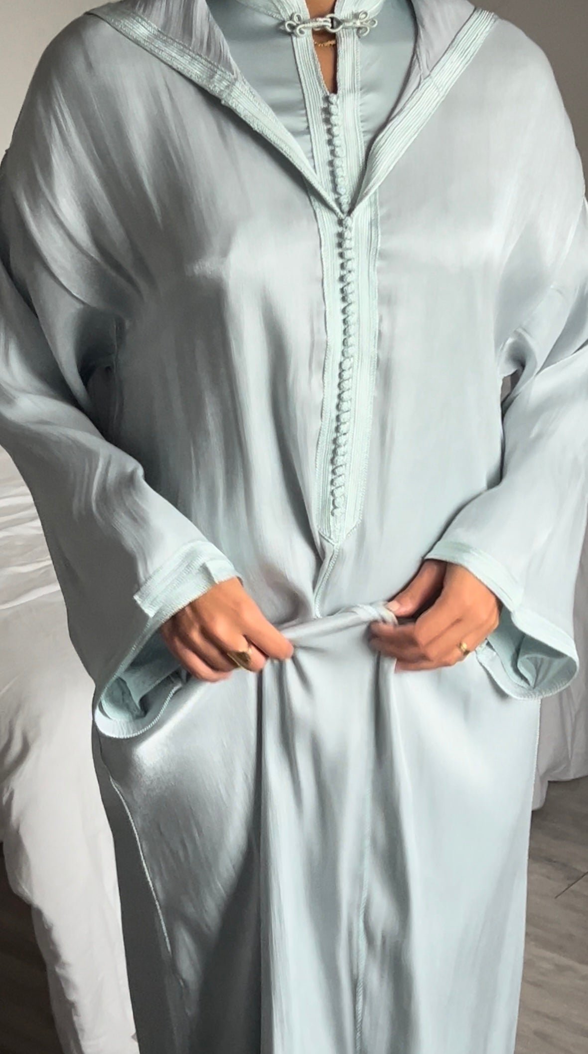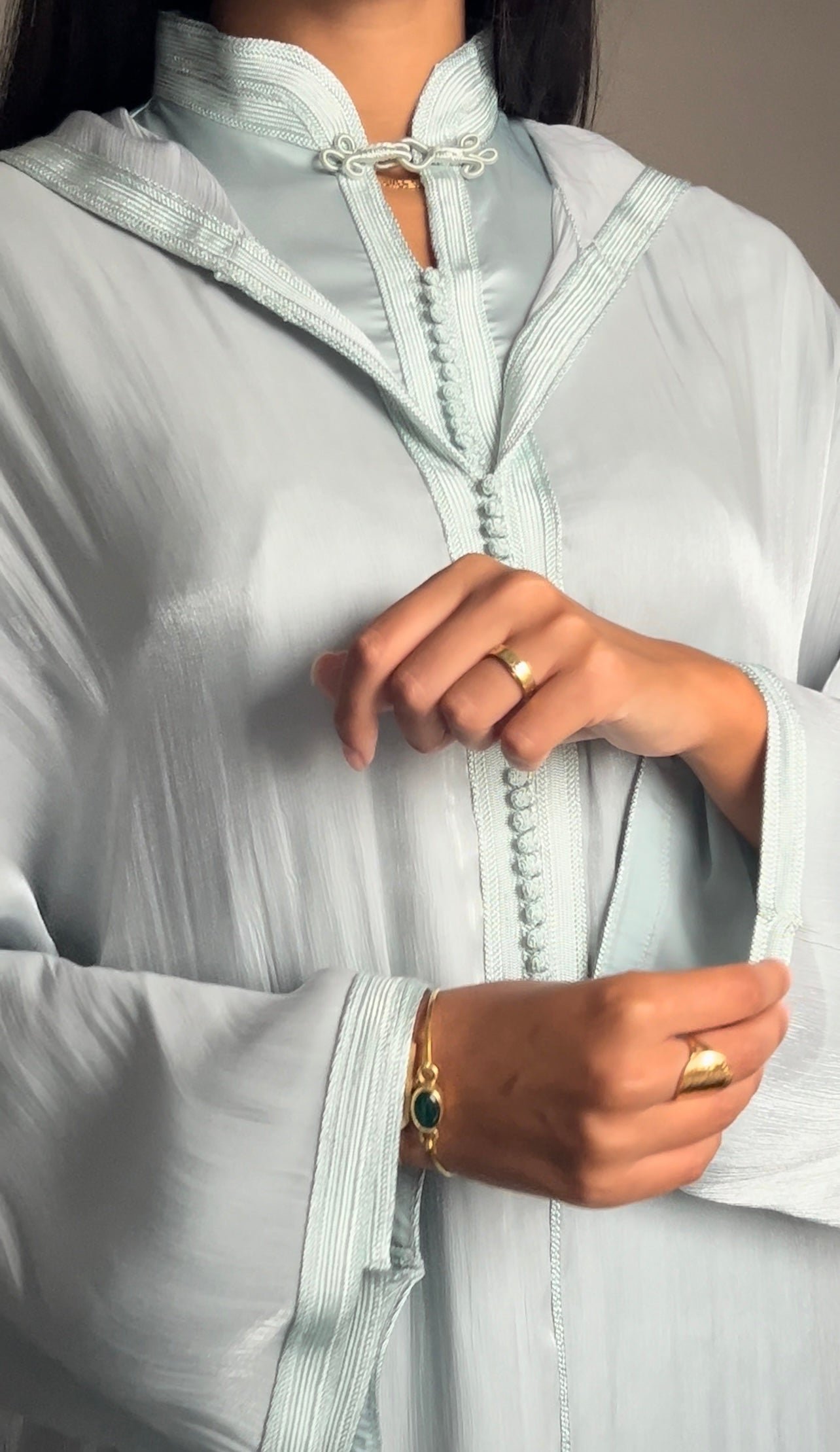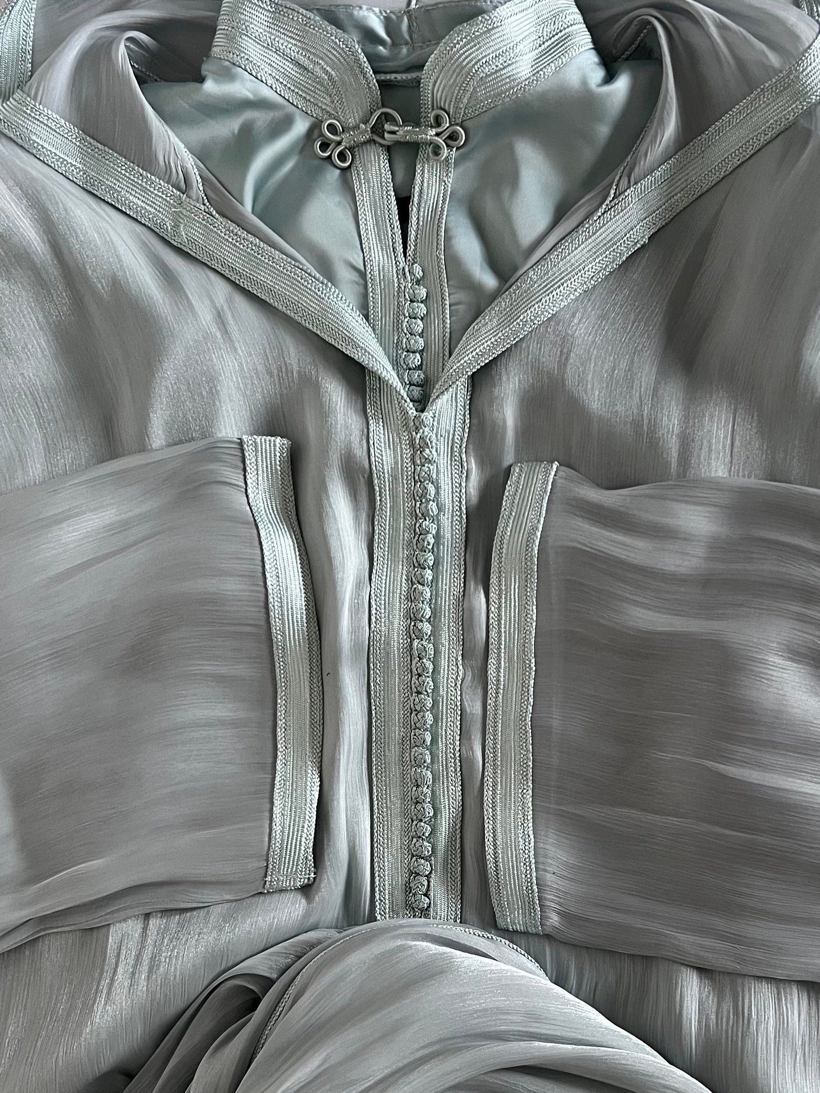 Djellaba confectionnée en organza de soie, avec un tombé fluide et élégant. Son col royal rehaussé de sfifa et sa fermeture raffinée. Entièrement doublée en satin. Chaque détail est travaillé à la main par nos artisans marocains.